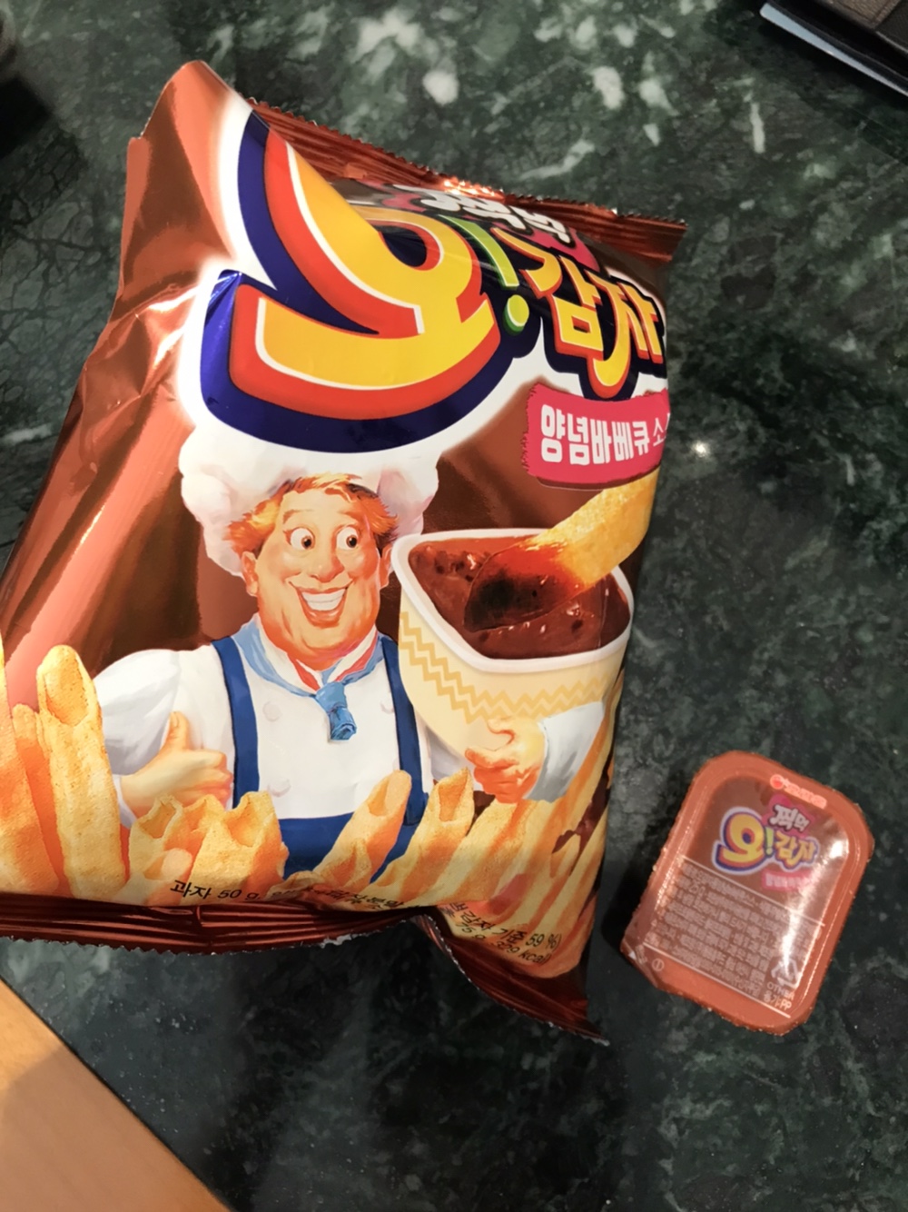 생수 2L 한 병과 과자 두 개 사왔다.